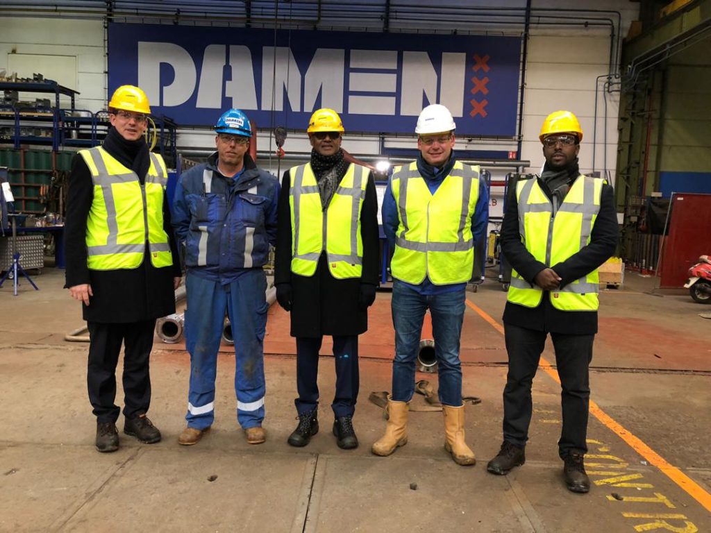 Dans le cadre du lancement prochain de la construction d’un chantier de réparation navale à Djibouti, le président de l’Autorité des ports et des zones franches de Djibouti, Aboubaker Omar Hadi, a effectué du 20 au 23 janvier 2019 une visite de travail aux Pays-Bas. Durant son séjour là bas, le président de l’APZFD a eu des délibérations fructueuses avec les dirigeants du groupe néerlandais DAMEN, leader mondial dans les domaines de la réparation et la construction des navires.