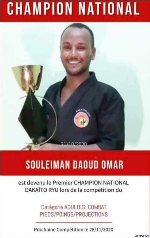 Par ailleurs, M. Souleiman Daoud Omar, suite à des performances et démonstrations techniques innovantes et inédites est désigné par les experts de la discipline sportive Dakaito Riyu, comme étant le champion national, niveau adulte.