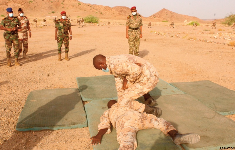 Une fois le briefing entamé, le CEMGA a pu assister à différents ateliers de démonstration des acquis. Ces ateliers multiples permettent une restitution des savoir faire acquises par les stagiaires durant le séjour à l’école militaire de Holl Holl. L’objectif recherché est de mettre les stagiaires en situation opérationnelle en état de fatigue extrême pour faire face à toute éventualité. Ces démonstrations statiques et dynamiques sont des modules exclusivement enseignés à l’école militaire « Président Gouled ». Ces ateliers comprenaient des techniques d’intervention opérationnelle rapprochées (le corps à corps), le démontage/ remontage du fusil d’assaut tout en ayant les yeux bandés. Ceci ajoute une difficulté supplémentaire qui permet de canaliser le stress en terrain d’opérations. On pouvait aussi voir le secourisme au combat qui permet une rapide prise en charge d’un blessé en situation de combat offensif, le combat des localités sur un terrain dégagé et la lutte contre les engins explosifs improvisés déposés et enfouis dans le sol par l’ennemi sur le passage obligé des militaires.